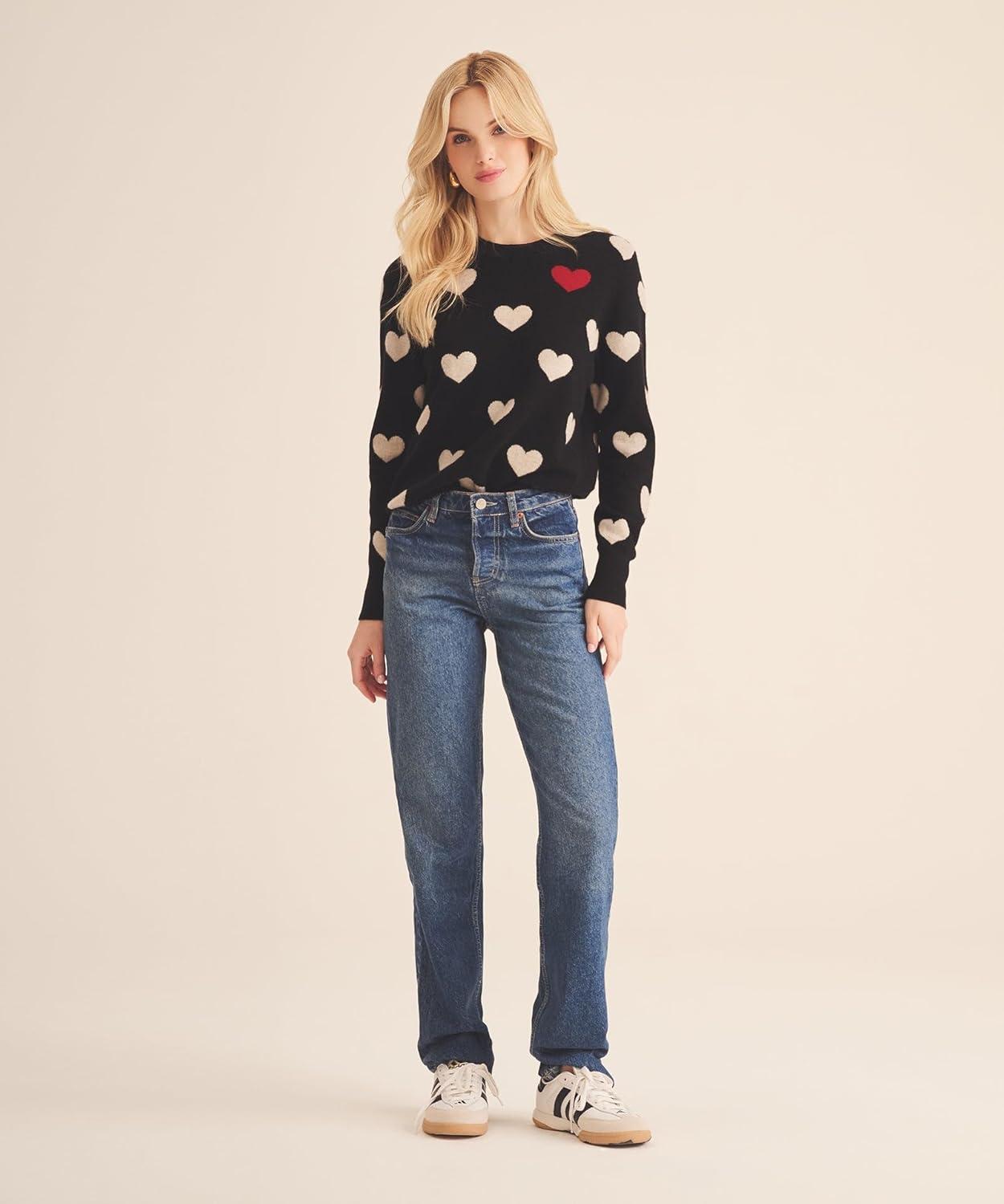 Naadam Womens Cashmere Heart Crewneck Sweater(Black Combo)
